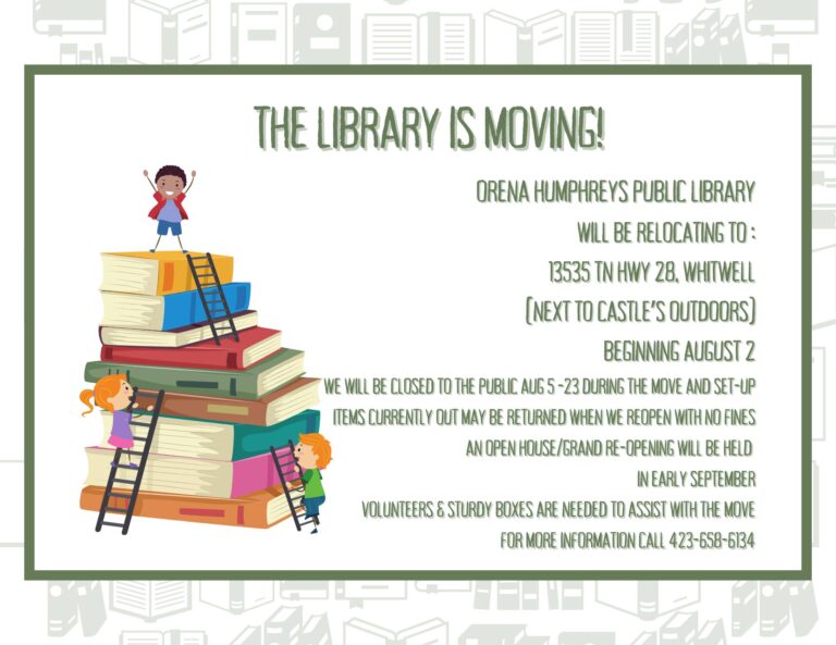The Orena Humphreys Public Library in Whitwell will be relocating to a new space soon and are in need of supplies and volunteers. “We are in need of boxes, volunteers…