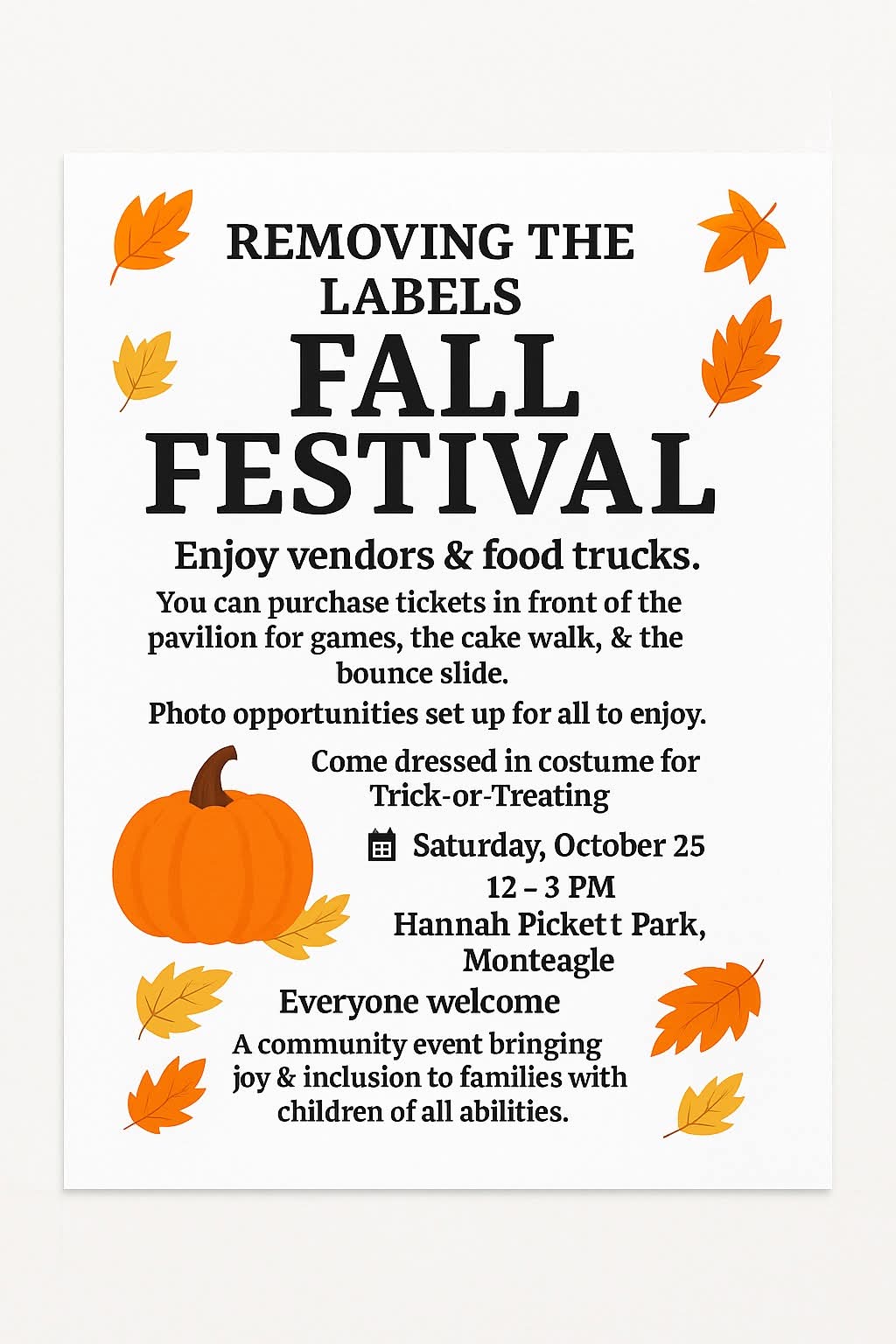 Removing the Labels, a non-profit organization based in Monteagle, is set to host their first annual Fall Festival on Saturday, October 25 from 12 p.m. to 3 p.m. at Hannah Pickett Park. Food trucks and vendors will be present, and trick-or-treating is welcomed during the event.