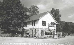 Kate’s Bar-B-Q was in operation at the Dixie Lee Junction in Kimball for decades. This postcard dates from 1952 and six people are seen in this card. The couple sitting directly in front of the building is believed to be the owners, John and Idabel Legg. They had a public telephone (which almost everyone used in the 1940s and 1950s), served food, sold gas, and were the Greyhound bus stop. John Legg’s car, seen in the picture, is a 1939 or 1940 Ford. Kate’s Bar-B-Q was located roughly between where Kimball’s Waffle House and RaceWay Service Station are today.