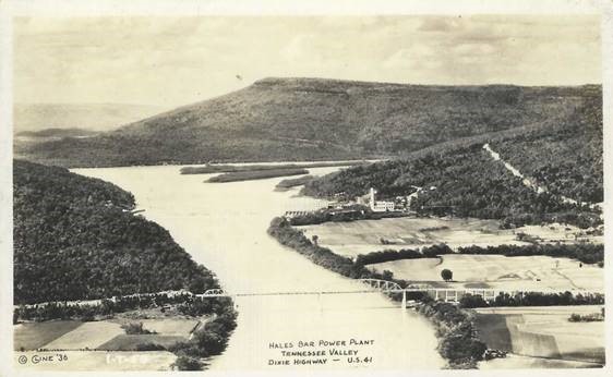 This is a 1950s chrome view of Hales Bar Dam from the west bank of the river. In 1933, R. J. Hoge