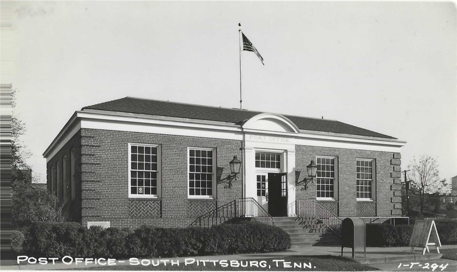 Dating from about 1944, this postcard of the South Pittsburg Post Office shows the blue, letter drop off box stationed in front of the Post Office. There is also a wooden board positioned nearby in which citizens could post bulletins. -Submitted by David Head...