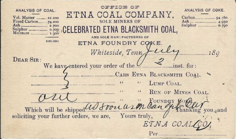 Home Memories of Marion Etna Coal Company, 1890 Etna Coal Company, 1890January 30, 2025 The Etna Coal Company at Whiteside, Tennessee sent this postcard to W. F. HUNT & BRO in Memphis, Tennessee on July 3,1890 letting… Login to continue reading Login Sign up for complimentary access Sign Up Now Close Previous Post Sandra Lynn Adams, 48 Next Post David Allen Hale, 53