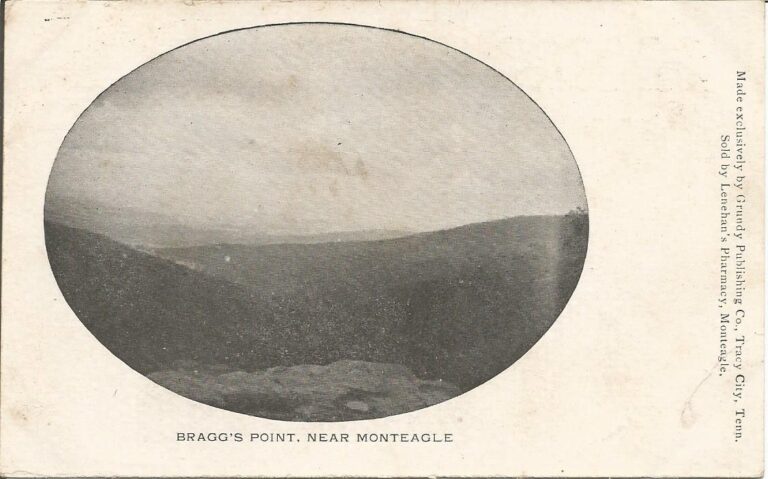 This circa 1906 real picture postcard shows Bragg’s Point near Monteagle, Tennessee. Lenehan’s Pharmacy at Monteagle marketed this card and several others, all… Login to continue reading Login…