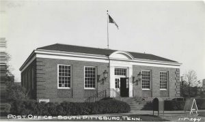 Dating from about 1944, this postcard of the South Pittsburg Post Office shows the blue, letter drop off box stationed in front of the Post Office. There is also a wooden board positioned nearby in which citizens could post bulletins.